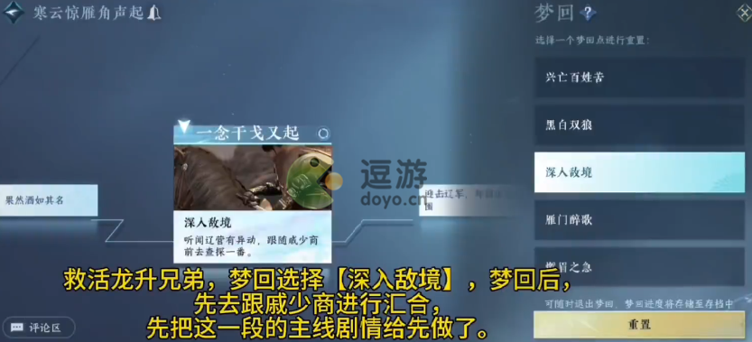 1、首先梦回选择【深入敌境】,这是龙家兄弟领盒饭前面的一个节点,你要是闲着要选择更前面的几个节点也是可以的。
