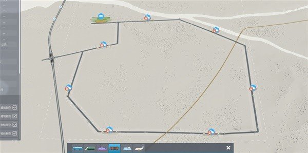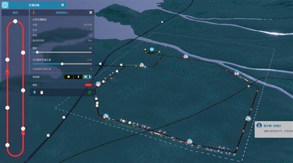 连接完全部地铁站之后线路1就完成了(下图将默认的绿色线修改为了红色醒目一点)。但是此时并没有通车,我们还需要将地铁总站接入线路,使用轨道连接总站其中一个轨道口和地铁站即可,接通后总站会派出地铁进入环线,我们的地铁线路就完成。