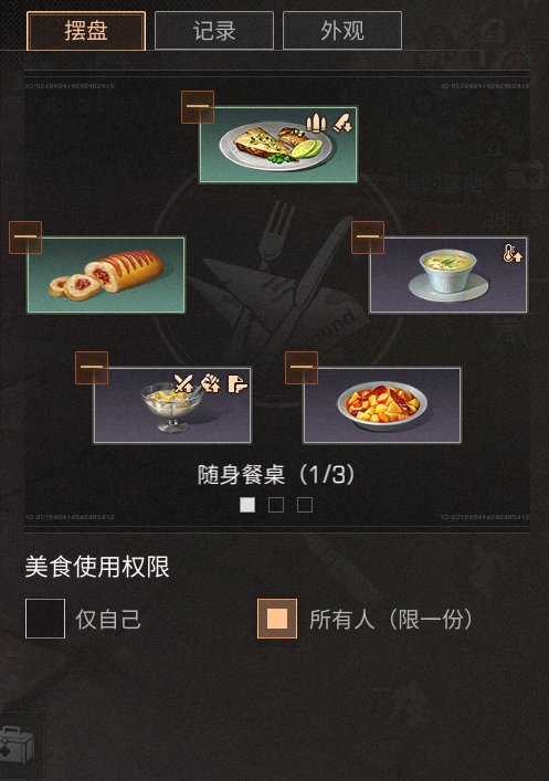 点击摆盘与设置,即可对选择想要享用的食物放上餐桌,同时可以设置美食的使用权限