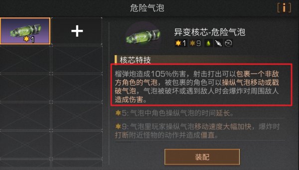 异变核芯-危险气泡为榴弹炮专属核心,装配后榴弹炮可打出105%伤害,并射击出一个可包裹非敌方角色的泡泡,被包裹角色可操纵气泡移动或戳破,气泡被破坏或遇到敌人,会爆炸对周围敌人造成伤害。