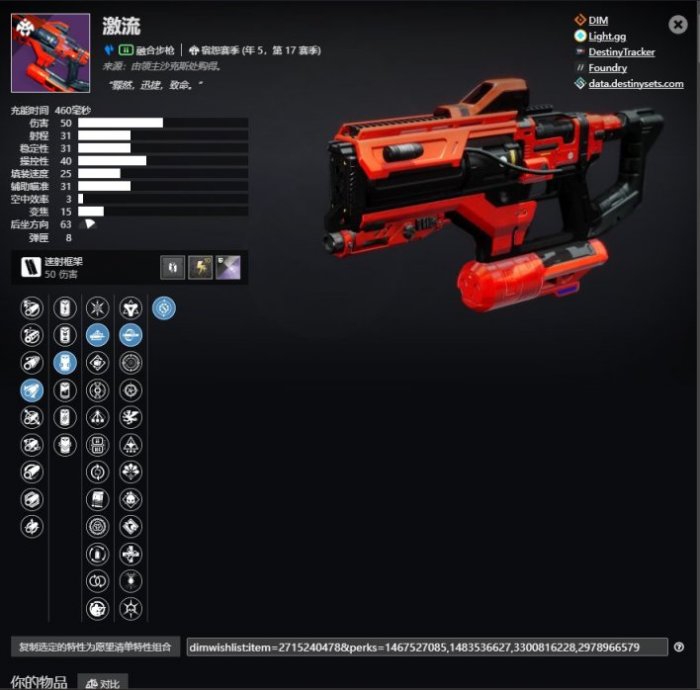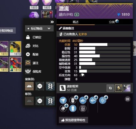 你可以看到有武器的各项数值,在这个界面上可以进行进一步的操作,包括但不限于对比,挪动武器所在的位置,查看不同词组对武器的加成,查看单一词组的效果,预览愿望单特性,假定大师之做等等。
