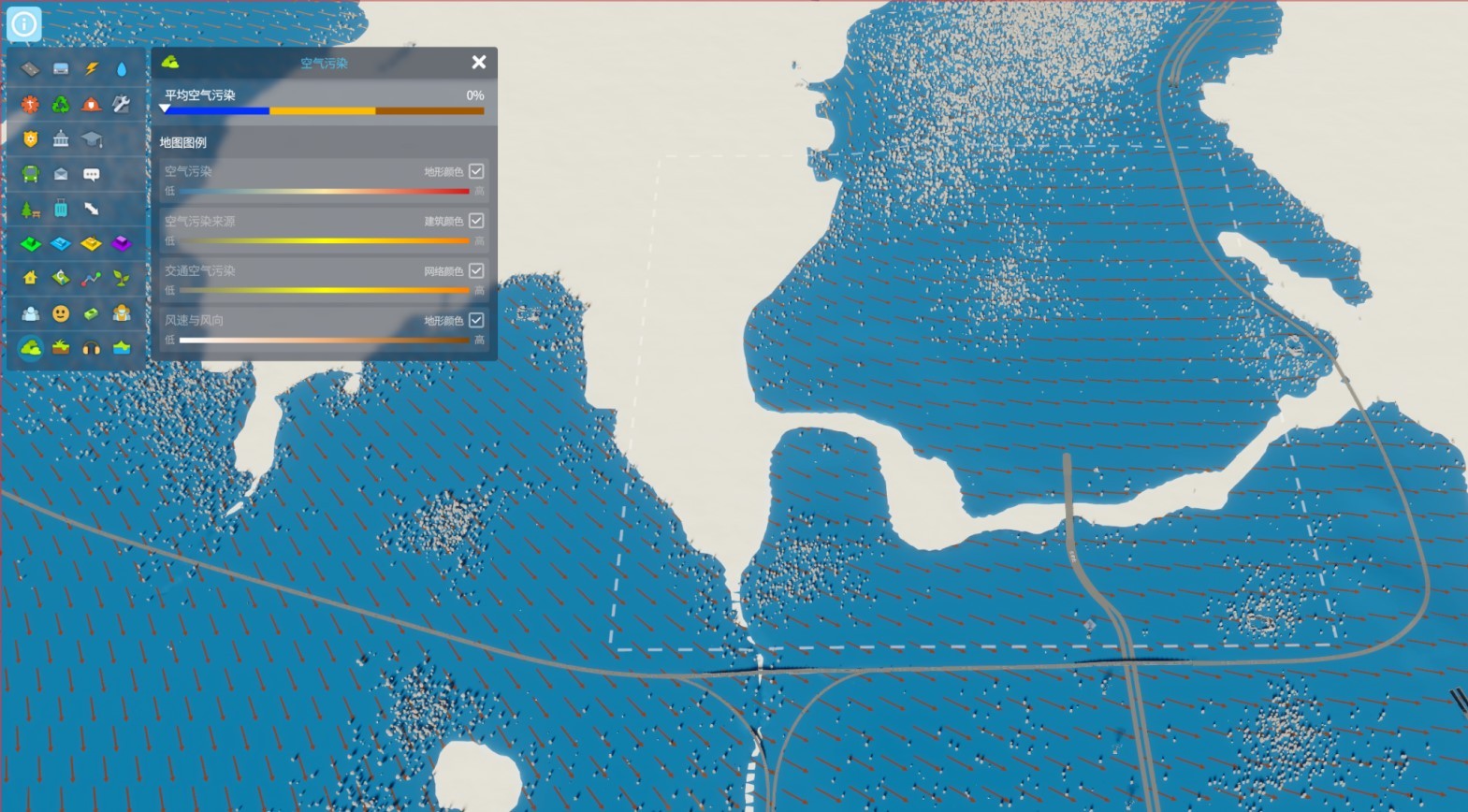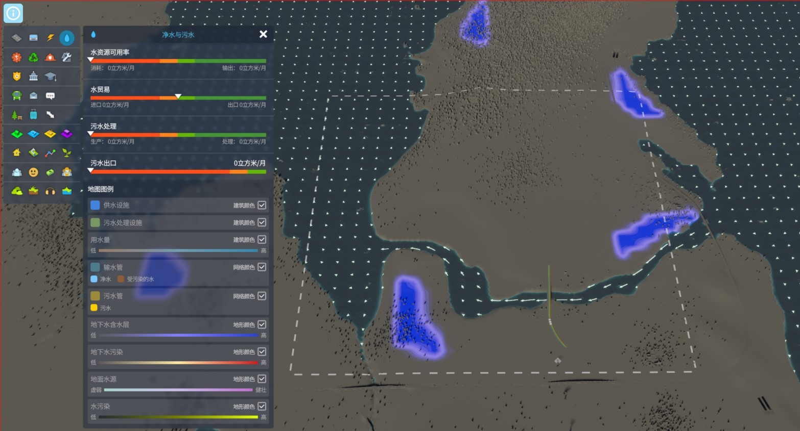 观察完这两种信息我们根据风向决定工业区的位置(地图右下角),而抽水站可以放置在地图红右上的小入水口,排污口放置于左侧,就能够保证开局的各种污染不会影响到住宅区降低幸福度,同时还能减少市民患病概率。
