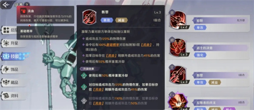 他的主动技能是"断罪",也是一个单体攻击技能,比普通攻击伤害更高。使用后,可以为目标添加一层连续两轮的出血效果。对于已经受到出血效果的目标,会造成额外伤害,并有概率重置冷却时间,使你能够更频繁地使用这项技能。