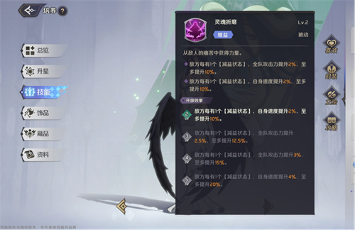 雅儿贝德的被动技能叫做“灵魂折磨”,当敌人受到减益状态时,它将提高全队的攻击能力、雅儿贝德自身的移动速度和攻击速度。这个技能使雅儿贝德在战斗中更具主动性,能更好地影响整个团队的战斗表现。