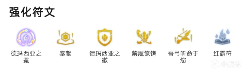 强化符文:必备德玛西亚之徽、德玛西亚之冕,莫德凯撒需要带德玛西亚转职。奉献,拿这个强化也能得德玛西亚转职。禁魔镣铐,德玛西亚专属强化,提升德玛弈子们的伤害。源计划血蛭、药剂师、治疗法球,增强阵容续航回复能力。吾弓听命与您,获得一个反曲弓并提升全员英雄攻速。红霸符,攻击附带重伤和持续灼烧效果。