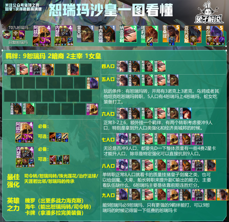 标准阵容:9恕瑞玛 2暗裔 2主宰 1女皇