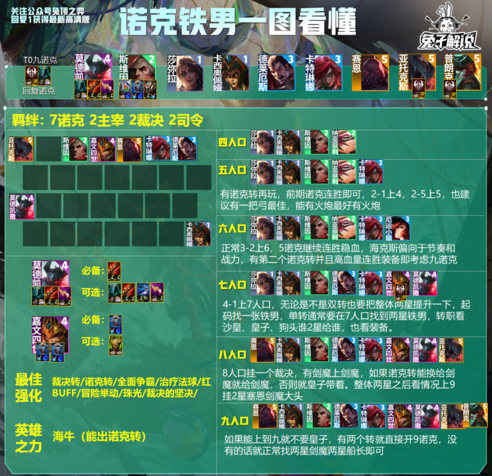 如果对局开出诺克转的话建议走连胜玩法,因为诺克前期连胜轻松加上提早叠好诺克层数后面转阵容时会舒服点,玩诺克只要前期过渡好是很容易轻松到9的,现在对局很容易出现两个诺克转的情况,只要能开到9诺克这把就拿下了,正常8人口7诺克的话两星铁男吃分也轻松,阵容如果能上九是不要皇子的,正常8人口要皇子就好