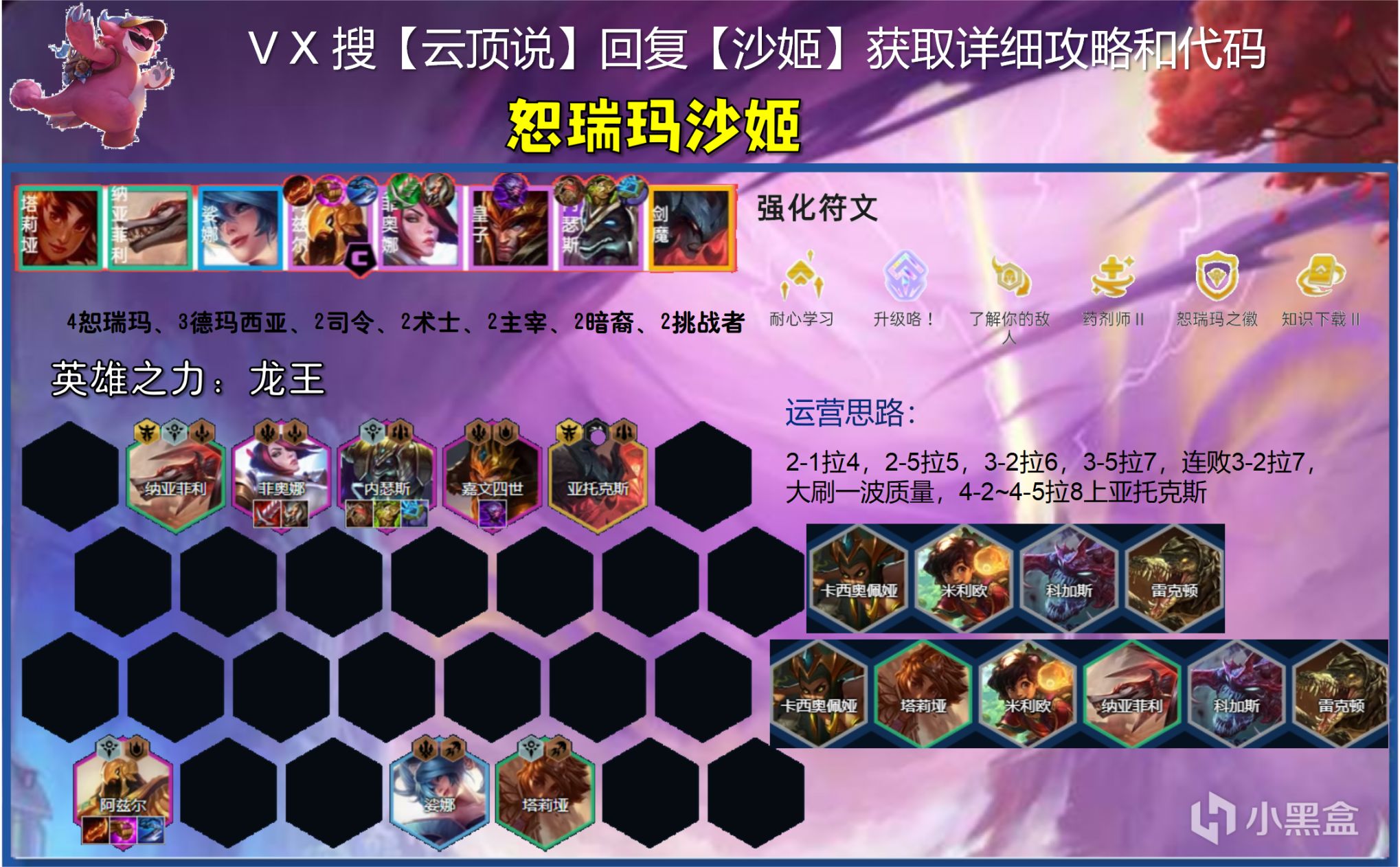 战力型强化可选:恕瑞玛之徽,8人口可以开6恕瑞玛。吾弓听命与您,获得一个反曲弓,并提升全体英雄攻速。了解你的敌人,提升阵容输出。治疗法球、药剂师,增强阵容续航。
