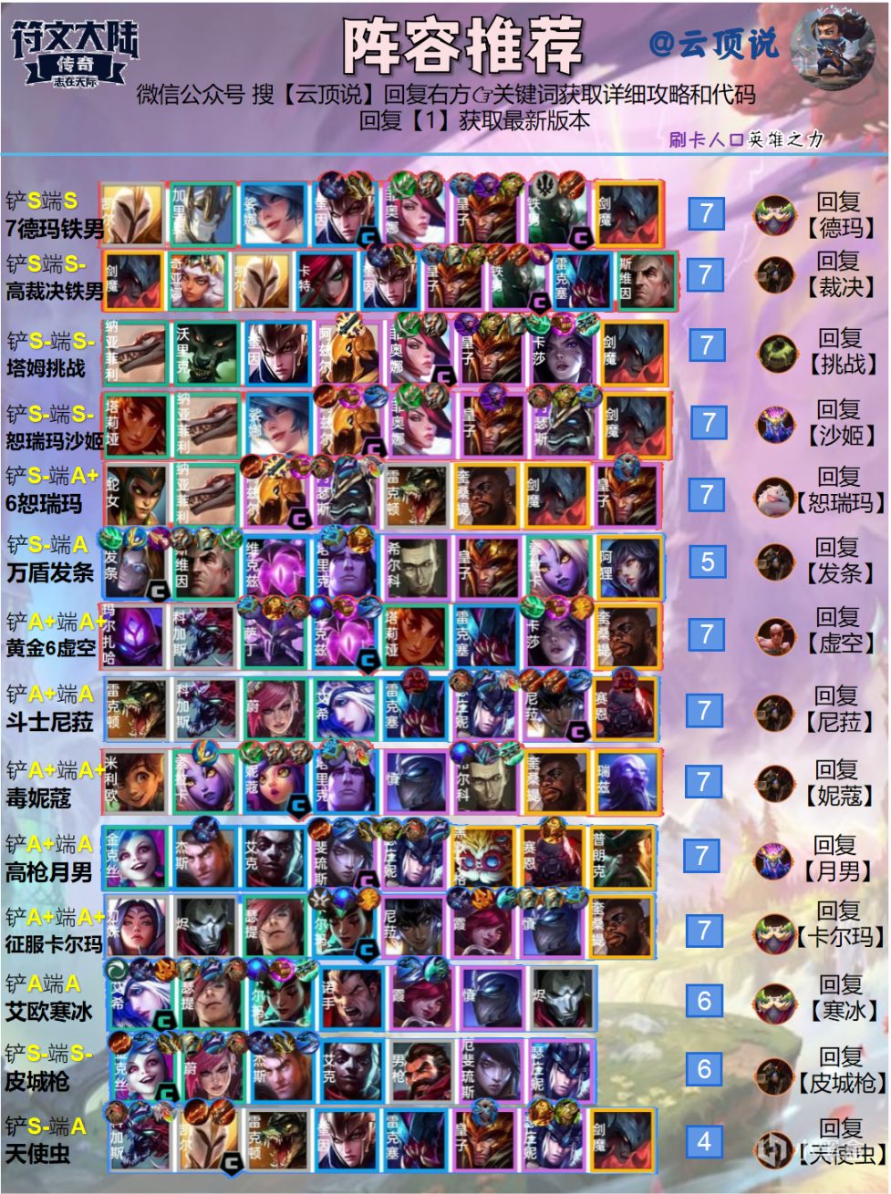 正常过渡在3-5拉7人口,连败就在3-2拉7人口。然后大刷一波,找出阿兹尔、菲奥娜、内瑟斯、嘉文四世等体系卡,开出4恕瑞玛3德玛西亚。之后存钱拉人口。