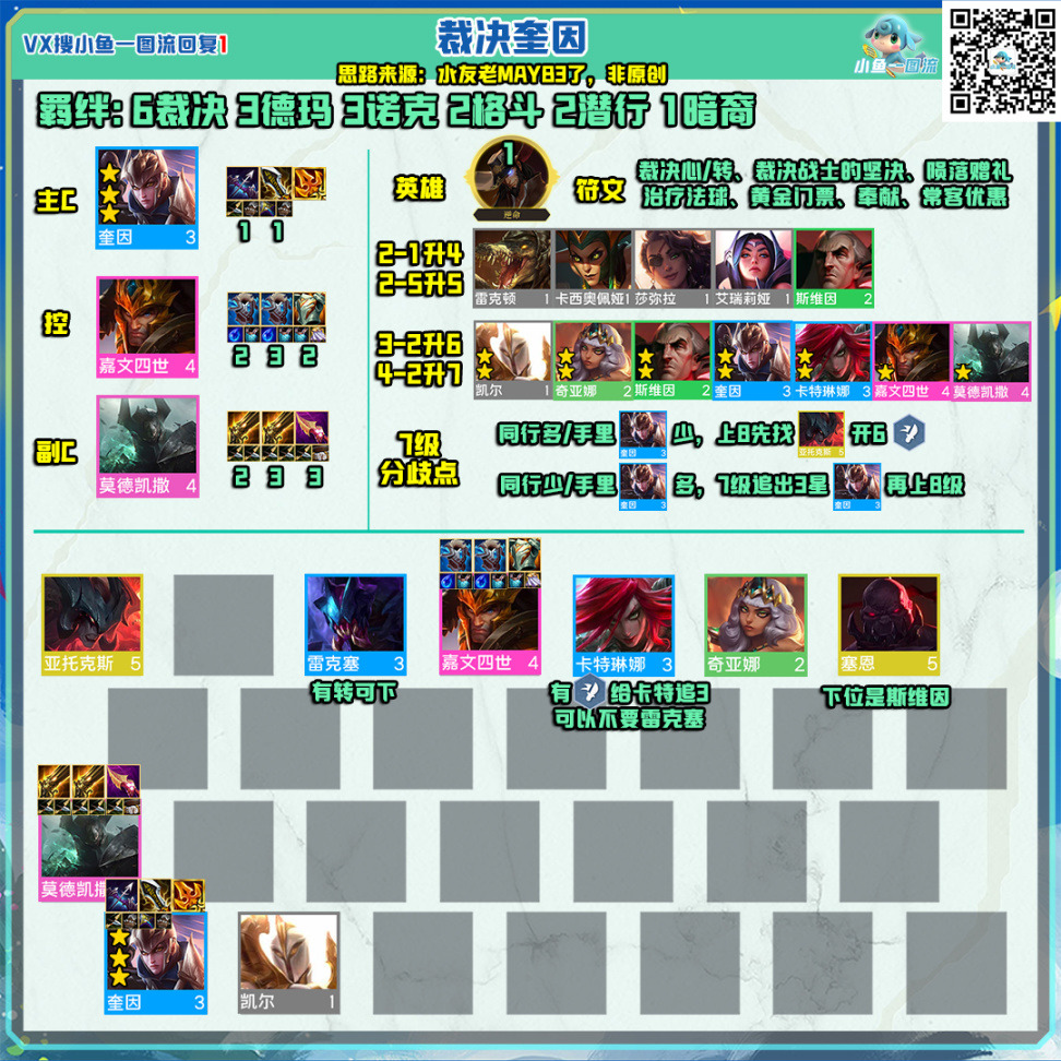 简评:现在云顶比赛上更多是7德玛4裁决,在金铲铲里更多是6裁决3德玛,或者5德玛