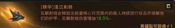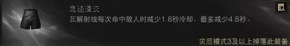 图上选择主手瓦解射线增伤,如果想要走极致无限开射线,可以带新的裤子,瓦解射线命中敌人减CD,12秒每次命中敌人最多减4.8秒,也就是只要打中3个敌人就可以减到4.8秒了。新裤子急速湮灭就是为湮灭荆棘专门搭配的裤子(从名字也看的出来在联动),因为减CD对于引导类技能没用,引导类技能差的是能量回复。