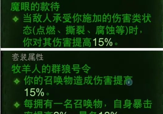 绿装推荐4牧羊人+2魔眼,牧羊人把召唤物的伤害加成拉满,同时自身暴击也跟上,我们不要小看了自身魂火的普攻,在暴击流中也拥有占比17%1468万的伤害。2魔眼则是确保我们把负面状态加成拉满,全程增伤15%。