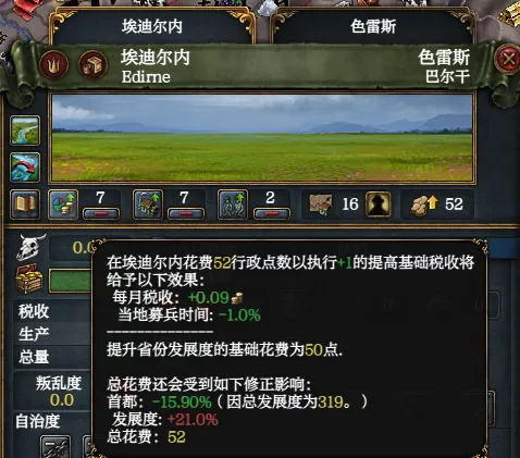可以看出,发育程度有三种,分别对应三种点。和税收挂钩的是行政分。所以税收是欧4中最固定也最被忽视的收入来源,因为行政点基本都是用来建核心的,没有老玩家会用来种地。可以说,税收是你国家财政的一个常数。你不用担心,它只会随着你领地的扩大而慢慢增加。