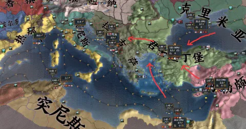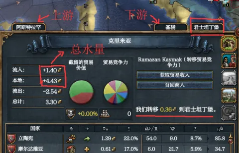 这张地图是欧罗巴普universalis 4中信息量最大的一张,我还是看不懂。但至少我能看到,贸易像高山流水一样,在每一个交易节点都有短暂的停留。它的流向很复杂,但总的来说,财富是顺着水从东向西的。君士坦丁堡是奥斯曼的贸易总部,还有三条支流(克里米亚等。)流入君士坦丁堡节点。如果你把一个商人放在这里收钱,就相当于切断了水流,抽走了一部分。一个节点能抽多少水,取决于你在这里的贸易竞争力和你在这里停留的总水量。所以到处抽烟毫无意义。我们假设你不改变开市时的交易总部。第一步,切换贸易地图,找到你的贸易总部,在你的贸易总部放一个商人来收钱(商人还有5%的贸易竞争力加成)。第二步,把你多余的商人往上游引,让更多的水流入你的总部。例如,在克里米亚指导: