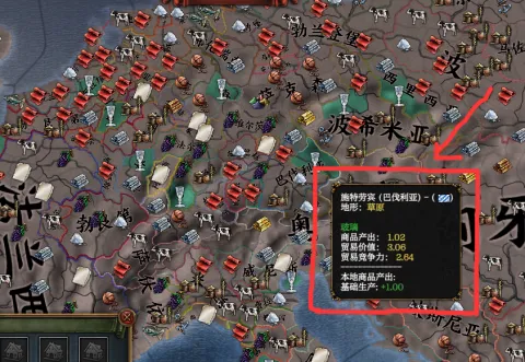 2。生产收入在发展程度上与外交点数挂钩,外交点数是这个游戏中最富有的点数。所以很多老玩家会用额外的外交点数去种地,生产收入也是游戏后期比较重要的收入。然而,比发展程度更能影响生产收入的是贸易商品的种类,即该地区生产的商品。游戏中有一个特殊的地图可以显示。简单来说,商品价值越高,生产收入越高,每发展一个度,带来的收入就越多。