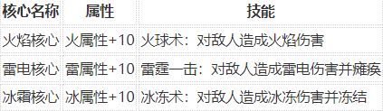 使用表格可以清晰地列出核心的名称、属性和技能,方便玩家对比和选择。