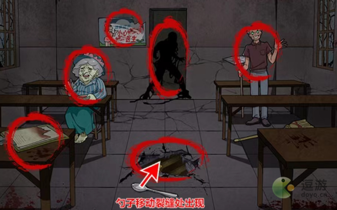 2、然后第二个场景内,点击诡异老人、标语、病例、奇怪的黑影、奇怪病人,出现勺子,将勺子移动至裂缝处