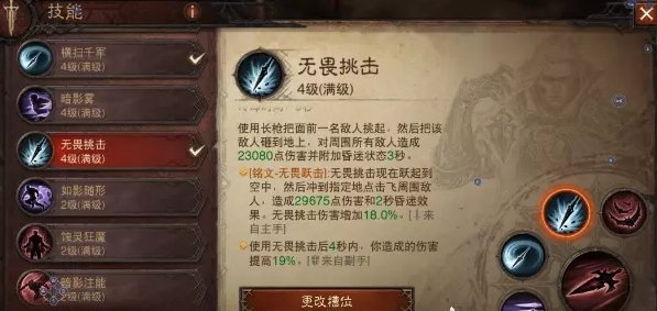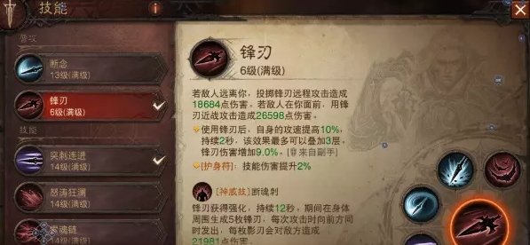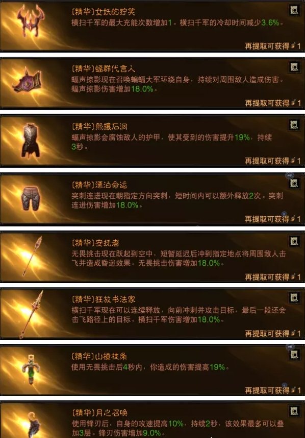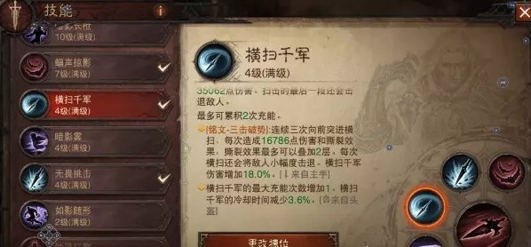 这套玩法就是把狂骑士的3大位移技能全部拉满,新精华让横扫千军也变成了强力的位移,最后3位移技能搭配蝠声掠影的AOE伤害来打输出,如果你玩的非常流畅几乎没有使用普攻的时间,所以副手精华唯一的空位就带了月之召唤加攻速即可,这也是在技能都CD的时候能最快打出锋刃伤害的方式。