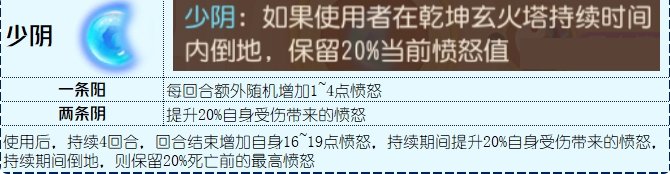 少阴持续倒地,最高能保留30点愤怒,这一预设其实跟被笑里保留愤怒一个性质,使用期间被倒地的机会是多少,如果没有倒地,则一点意义都没有,另外倒地前的愤怒也不一定会高,如果扶起来后,还有持续回合,那么少阳多一回合的持续也是可能把少阴的倒地保留给补回来的