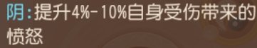 所以,在单次获得的愤怒值较少的时候,阴属性增加的效果也会较低甚至是没有,比如单次10%以下气血损失时,阴属性效果被约掉了