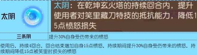 太阴的收益只有在被笑里的时候才会体现,不过就算被笑里了,少掉的15点愤怒也只是跟少阳增加1回合持续的基础效果持平,算上少阳1回合的两仪效果,就算被笑里,也没少阳好。