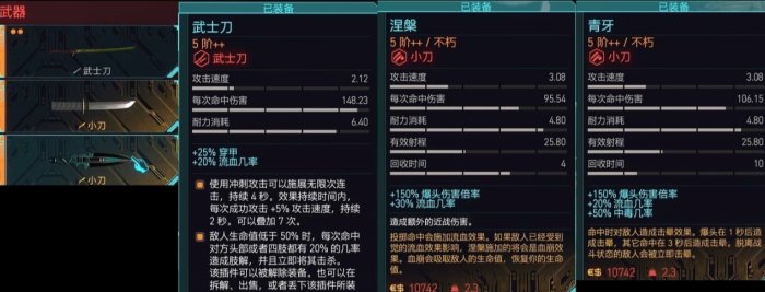 满级组装太刀和满级白虎面板是一样的,数值都是148.23,白虎是击杀敌人触发攻速流,组装太刀是冲刺攻击触发攻击,最高叠加7次到35%的攻速,在敌人半血时命中敌方的头部,或者四肢有20%的几率肢解,可以直接秒杀。两把攻速流武器看个人手感选择。