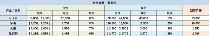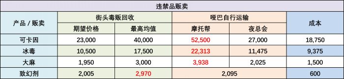 参照个人销售和贩子回收,我们可以很清晰地看到,多数情况下玩家自行运输的利润更高;少数情况下,贩子关于致幻剂的报价会比自行运输更高。