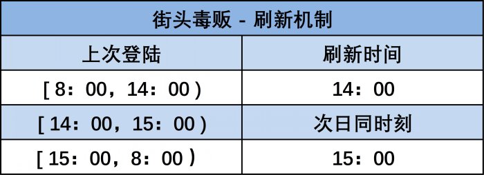 和其它每日收藏品一样,街头毒贩也有固定的刷新时间,但官方使用的机制相对复杂(注意时刻的开闭区间)。