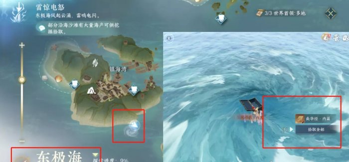 位置:东极海(1888.1173)处,有一个大宝箱,打开后即可获得南华经·内篇。