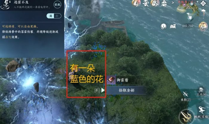 位置:谪仙岛浮生度传送点附近(810.782)在石头最上边有一朵蓝色的花,采摘即可获得御雷盾技能书,配合迅雷不及特质更好用哦~