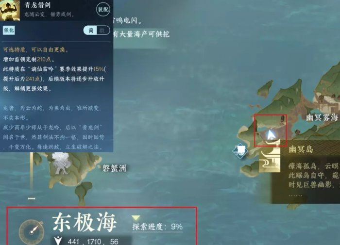 位置在幽冥雾海(441.1710)处打开大宝箱即可获取青龙借剑特质。