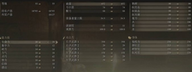 后面就差不多这样点,玩到后面属性收益就很低了。武士前期把血量加到20增加容错,然后根据所选武器的能力值要求加点,然后想玩力敏的话就加力敏,就像猎犬弯刀就需要18力量,17灵巧,出血效果非常强力。