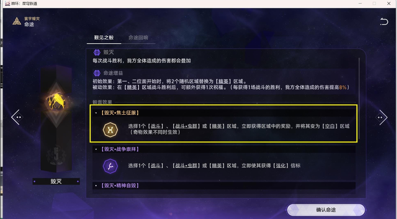 (1)选择毁灭命途,再使用一次金色【骰面效果】,将【战斗区域】或者【战斗·虫群区域】或者【精英区域】变成【空白区域】,然后再进入【空白区域】后,即可获得该成就