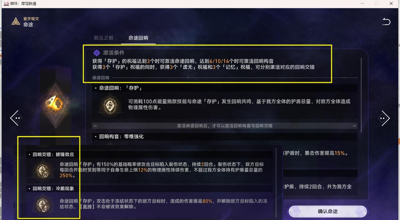 (1)比如下图,当我们选择存护命途后,在我们拿到最少3个【存护祝福】后,再分别拿到最少3个【虚无祝福】和最少3个【记忆祝福】后,我们就能激活2次回响交错了,就能获得该成就了