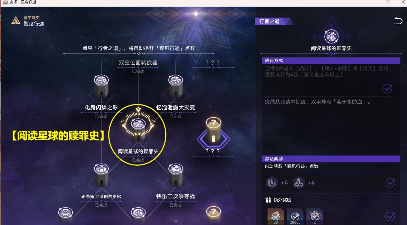 (1)在刚开始刷【行者之道】时,当我们用毁灭命途完成难度3下图【阅读星球的赎罪史】【行者之道】时,我们就直接退出