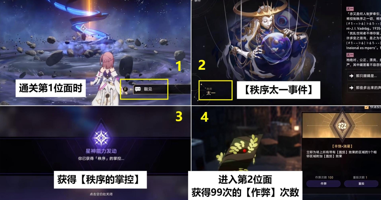 (2)然后用「丰饶」命途进入难度1,当通关第1位面时,我们就会遇到【秩序太一事件】,会获得【秩序的掌控】,接着继续进入第2位面,我们就能获得99次的【作弊】次数,然后再按照下面第2种方法第2位面操作步骤做即可