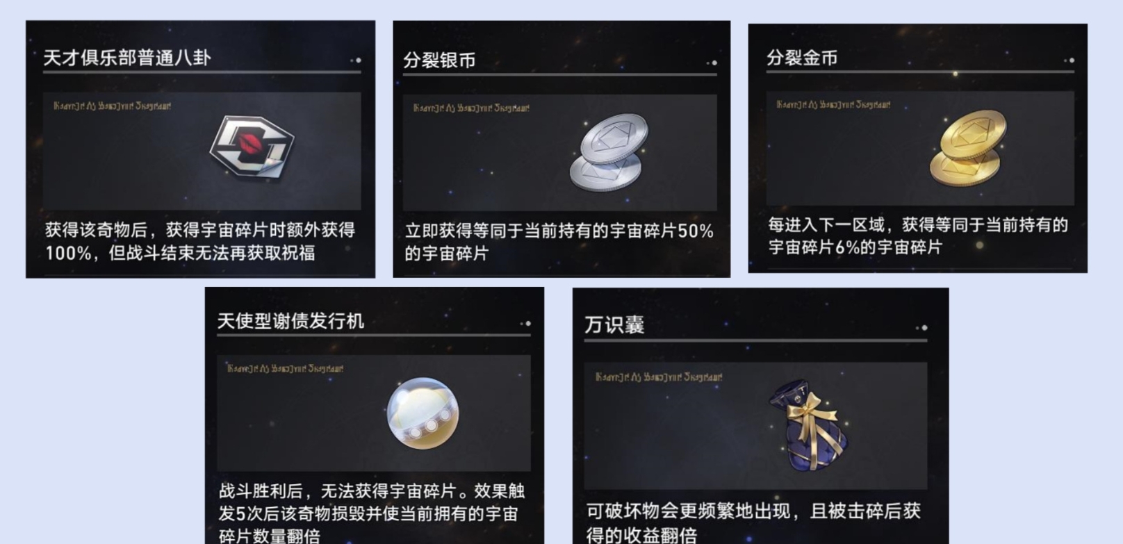 (1)选择使用「记忆」命途,多复制一些【事件区域】,遇到事件【谢债发行机】,选奇物【天使型谢债发行机】,另外尽量在【事件区域】能拿到奇物【分裂银币】或者【分裂金币】,还有尽量少走各种【战斗区域】,战斗收益比较低