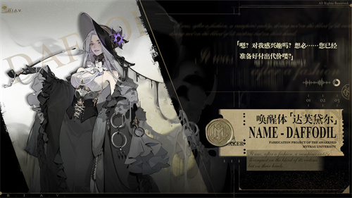 达芙黛尔,别名水仙夫人,是超维界域中的SSR级稀有角色,只能通过特定角色活动唤醒。她隐藏在华丽的黑色装饰背后,一副沉着的外表掩盖了许多不为人知的秘密。无人了解她的内心想法,与她交流的代价高昂。