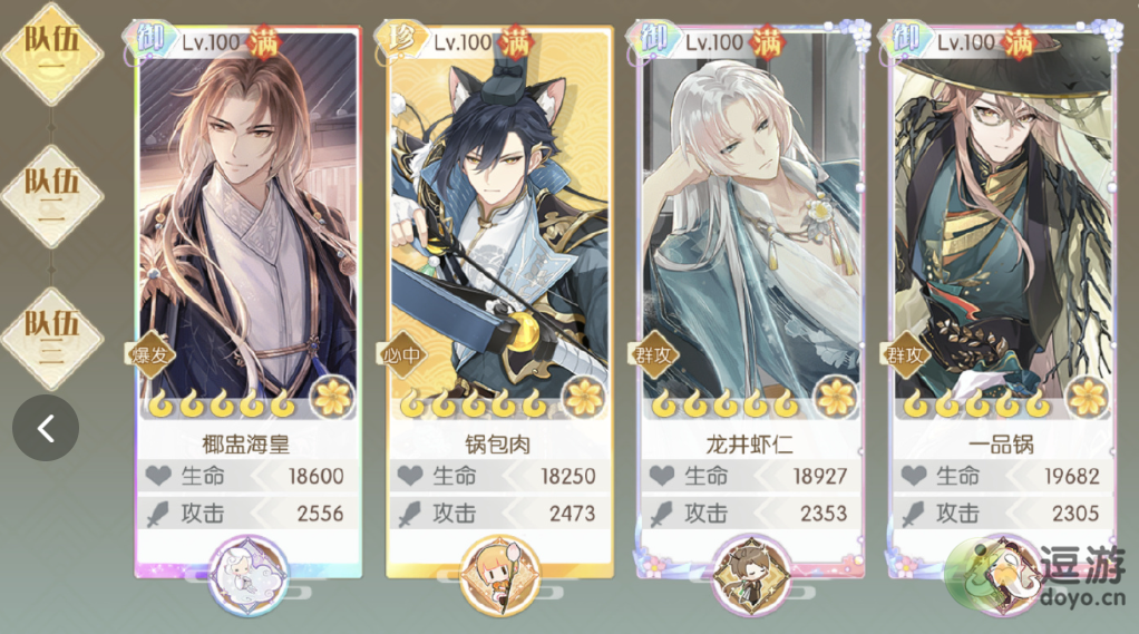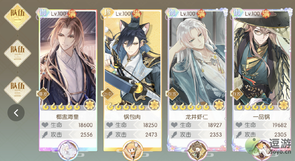 3、第三队:臭鳜鱼+双子+群攻(优先倍率高的带暴击套,比如4花烤鸭、满花一品等)+多段群攻(青金/绿松,青精饭最优)