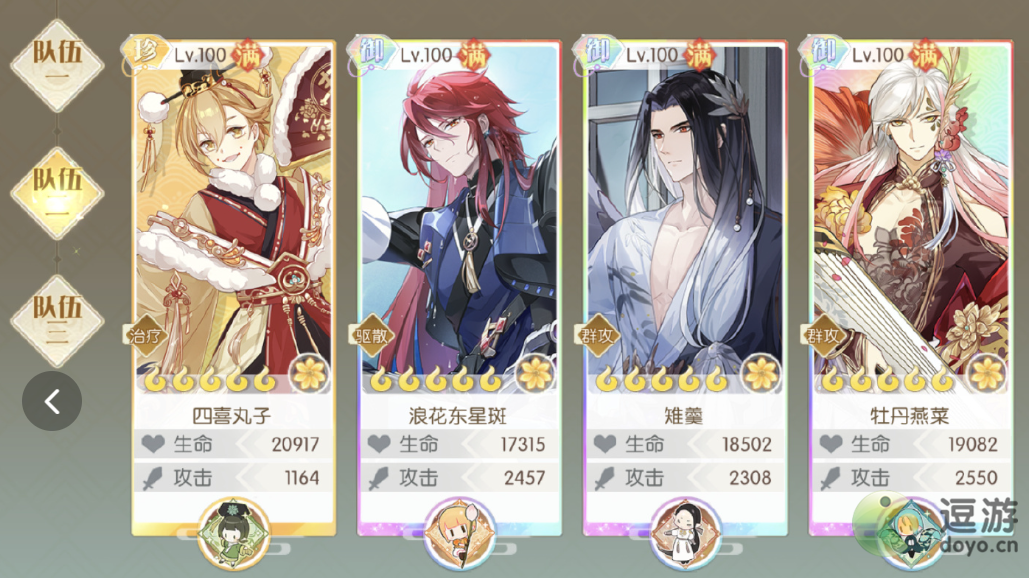 2、第二队:四喜+群攻(推荐东星斑,有提暴且倍率也很不错)+群攻/多段群攻(黄杨/沉香或匏制)+群攻收尾(青金/绿松)