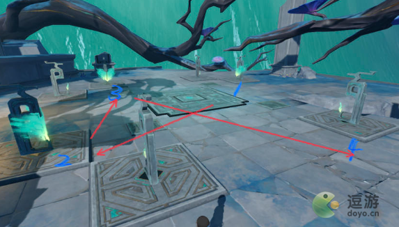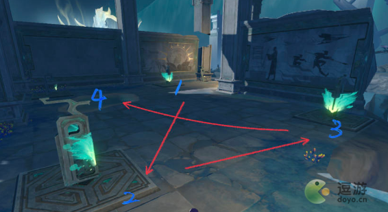 解密思路:根据石板来,石板上有1-4的四个小标记,与大地图对应