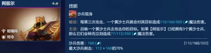 阿兹尔是恕瑞玛加司令羁绊,2恕瑞玛羁绊每4秒治疗恕瑞玛棋子5%最大生命值,特别是在8秒后阿兹尔飞升能获得20%最大生命值和30%攻击速度,增加阿兹尔的生存能力与输出频率;而司令羁绊能为前2排的友军增加15秒250的护盾,后2排的友军们获得15法强,进一步提升了阿兹尔的技能伤害。