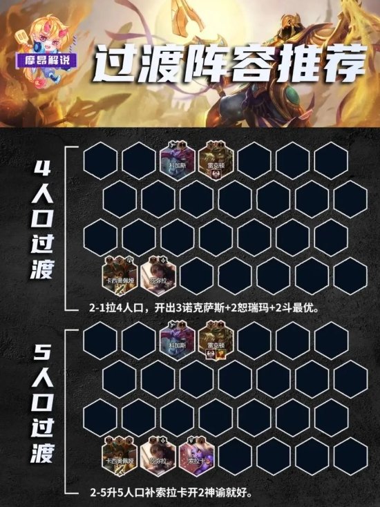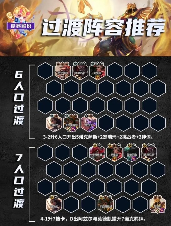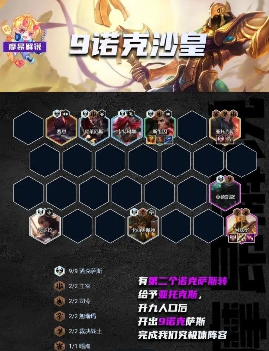 如有第二个诺克萨斯转给予亚托克斯,升九人口后开出9诺克萨斯完成我们究极体阵容。