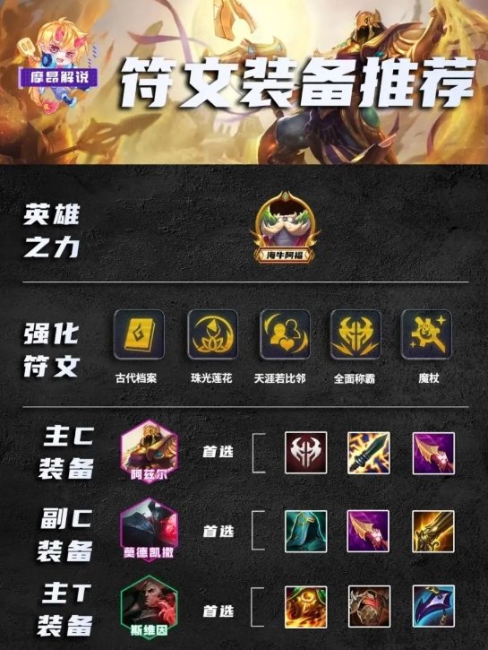 传说之力摩昂推荐海牛阿福,海牛第一个符文金/彩色是古代档案,有机会开出诺克萨斯转职,第3个符文在彩色符文阿福的百宝袋时还会给予2件随机基础装备、1个英雄复制器和1个金铲铲,而诺克萨斯转职是可以合成的(金铲子+腰带),当我们能上9人口开出9诺克萨斯的时大幅度增加了阵容的上限。