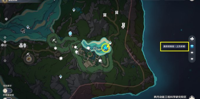 1、首先我们来到地图东侧【废弃实验室·上方水域】,在新地图枫丹动能工程科学院区的东南侧/地图右下角。