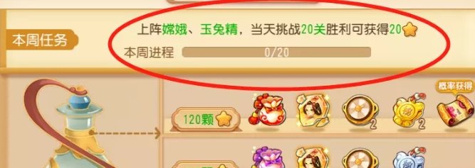 本任务每周只有一个,完成后自动获得20星砂,可以说是欲达成120星砂要求,本任务是必需要完成的,如上图所示,使用八戒和嫦娥出战,当天完成总计20关的战斗即可,这里不是指必然连续的20个关卡,也不是指必然的第1至第20关,只要是累计20个不同关卡即可,完成任务的难度都不是很高
