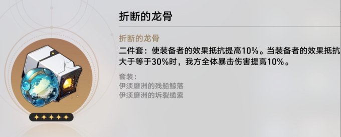 此时翁瓦克5%充能不关键,而且“提前行动”在多波次中收益不高,所以建议选择其他的内圈遗器。目前最佳是“折断的龙骨”,提供10%抵抗和全队10%暴伤。