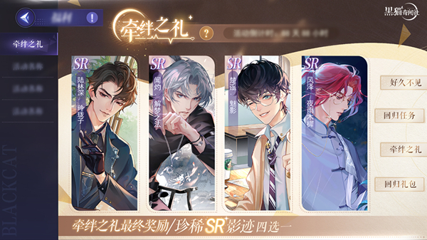 若社长大人们因事务繁忙而暂时无暇打理黑猫社也无需担心。超过连续15天未登录游戏,再次回归游戏后将触发“牵绊之礼——回归活动”,完成系列任务即可获得丰厚道具奖励,达成最终目标还可获得珍稀SR影迹四选一礼盒!即便短暂未见,他也依然在黑猫社守候着你!