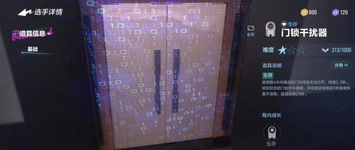 使周围4米内最近门关闭且无法打开,持续2.3秒。锁定状态的门处于半透明,并在锁定结束前1秒逐渐恢复不透明。道具冷却28秒