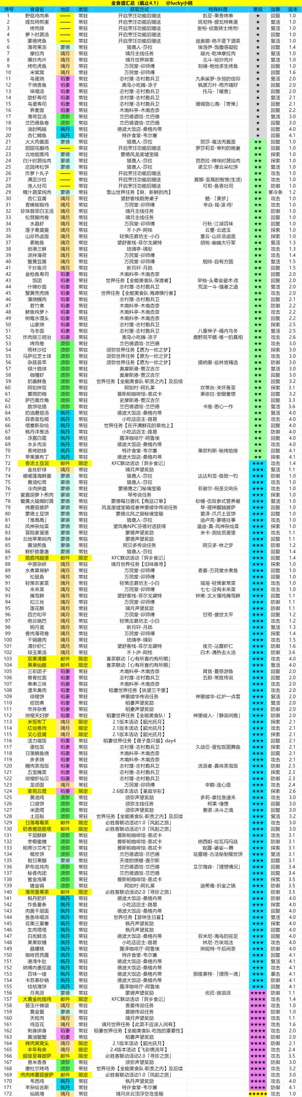 (3)文末仅展示4.1新增的10个食谱的表格,并补充1个特殊配方的获取,包括了角色特殊料理以及食物类型。